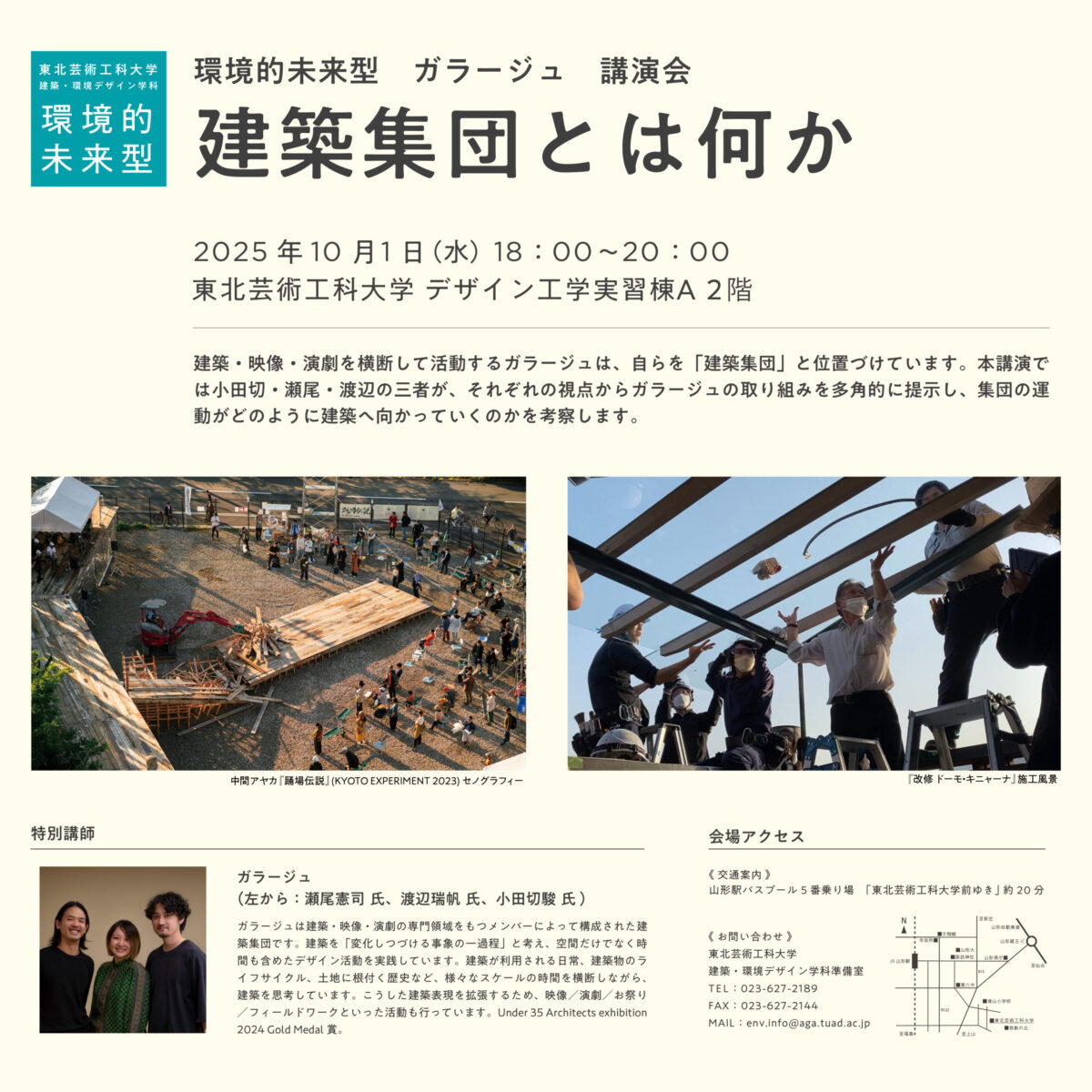 建築・映像・演劇を横断して活動するガラージュは、自らを「建築集団」と位置づけています。本講演では小田切・瀬尾・渡辺の三者が、それぞれの視点からガラージュの取り組みを多角的に提示し、集団の運動がどのように建築へ向かっていくのかを考察します。